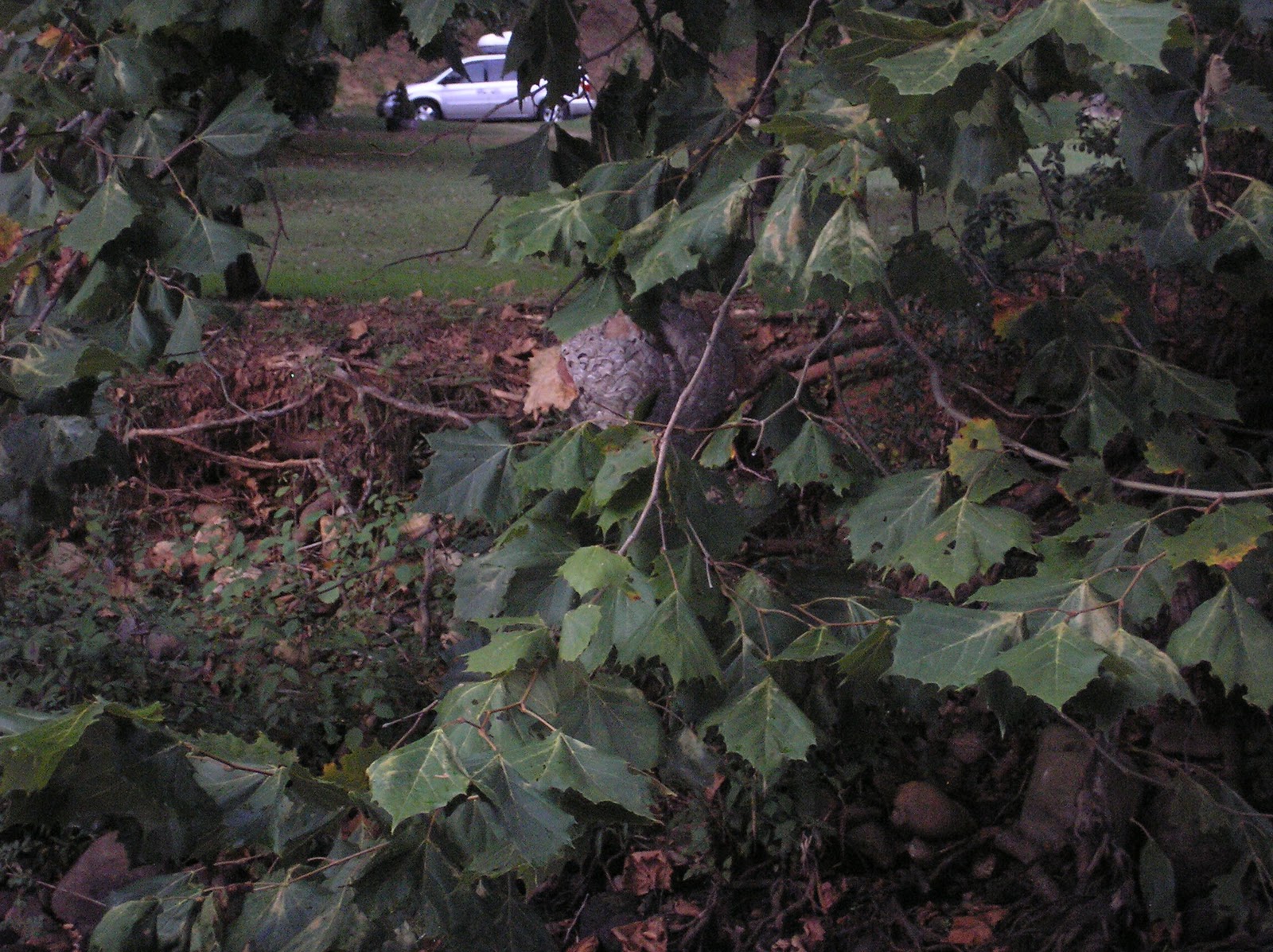 However, the fun quickly ended. Kaden wasn't feeling well and didn't want to play in the water so Traci and Kaden decided to head back to the cabin. Tami offered to help them cross the swift moving part of the river while I watched the other three kids playing on the rocks. Unfortunately, as they were crossing the swift part a tree branch was disturbed. Well, the unfortunate part was that this particular tree branch happened to be the home of a bee's nest. I was trying to get a picture of them crossing the river and as I was looking in my camera I noticed the moms were slapping themselves in the head and swinging their heads around. Then they both started screaming and Tami ran back towards us while Traci and Kaden ran the other way. The bees had attacked. It was a bit scary. Traci was stung several times, Kaden once, and Tami once. The rest of us were okay. We had to wait for the bees to calm down and then we crossed back over somewhere else. Here is a pic of the unfriendly bees' nest.